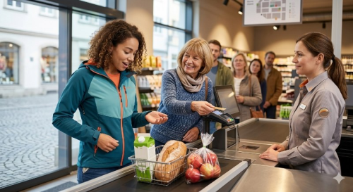 walletitemwomancashierlinebreadapplepeoplebasketstoretimemilkgroceriesdaypocket