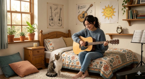 Every afternoon, I sit on my bed and play a song.